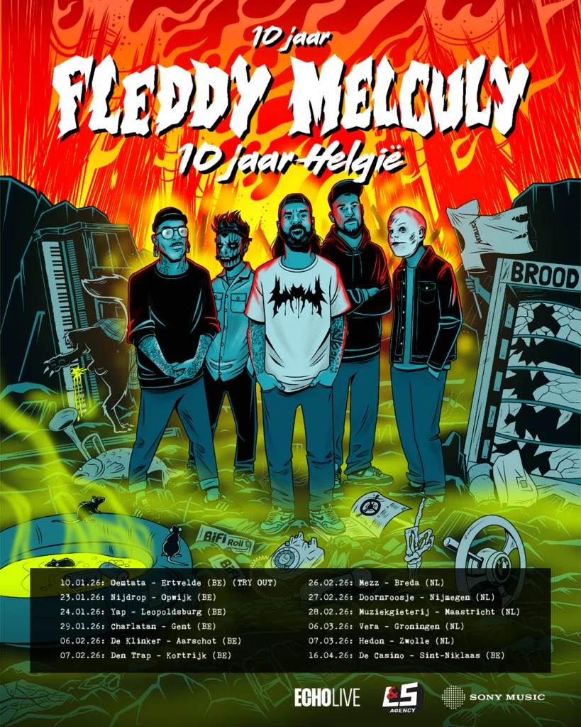 Een bandshirt dragen van een act waarvan je eigenlijk geen enkel nummer kunt opnoemen, maar puur draagt om cool gevonden te worden of te lijken. Tien jaar geleden was het de inspiratiebron voor een Belgische metalband om daar een nummer over te schrijven en dat zorgde meteen voor hun doorbraak. Dit nummer kwam toentertijd op hun debuutalbum Helgië en tijdens hun huidige tour staat Fleddy Melculy graag stil bij het jubileum van zowel dit album als de band, waarbij Doornroosje in Nijmegen niet werd overgeslagen.